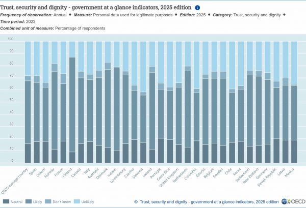 Well, not quite. This is wishful thinking. Let’s start slowly. Very Large Online Platforms (VLOPs), the platforms we all use on our smartphones, are subject to the European Digital Services Act (DSA). As of the year of its adoption in 2022 by the European Parliament, the European Union has a mandate to act, for example, against fraudulent websites that attempt to steel money from customers with fake content on VLOPs and, of course, on smaller platforms as well. To put it bluntly, the European Union has to defend its population from mainly American VLOPs massively exploited by Russian criminals to impinge on our European digital sovereignty. These external threats have to be taken very seriously as they touch upon the satisfaction and dissatisfaction with the European democratic political system and trust-based societies. The level of trust in Europe, particularly with respect to “Personal data used for legitimate purposes” is high in the Nordic countries and Ireland, but much lower in the UK, most Eastern, Central and Southern European countries. (Data retrieval from OECD on 2025-12-1, compare figure below, figure build Link).