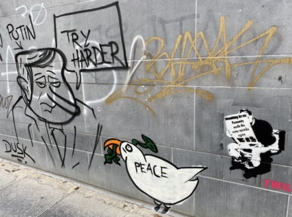 Putin has not only killed thousands of his own people, but he he has also killed the communists’ utopia of a better world and future, if only private property would be replaced by a top down, one party rule of a leadership that pretends to act on behalf of the people. Young Russians have little choice than to follow orders, learn how to bribe superiors not to be sent to the killing fields or be sanctioned. Putin has put an end to the ideas of Glasnost and Perestroika in Russia and utopian ideas about communism as well. He must have sensed it during his time in Eastern Germany that without brutality the Soviet union will not survive for long. As soon as he came back to Russia he prepared the shameless abuse of his power and ideas about a law-based socialist system in favor of the return of the military state. Borders are for those who believe in a rule-based international legal system. Changed to this international legal framework are hard to believe by European nations, but have to be accepted as a new form of “Realpolitik” in the international arena. (Image: Graffiti in Brussels Mont des Arts 2022-3-1)